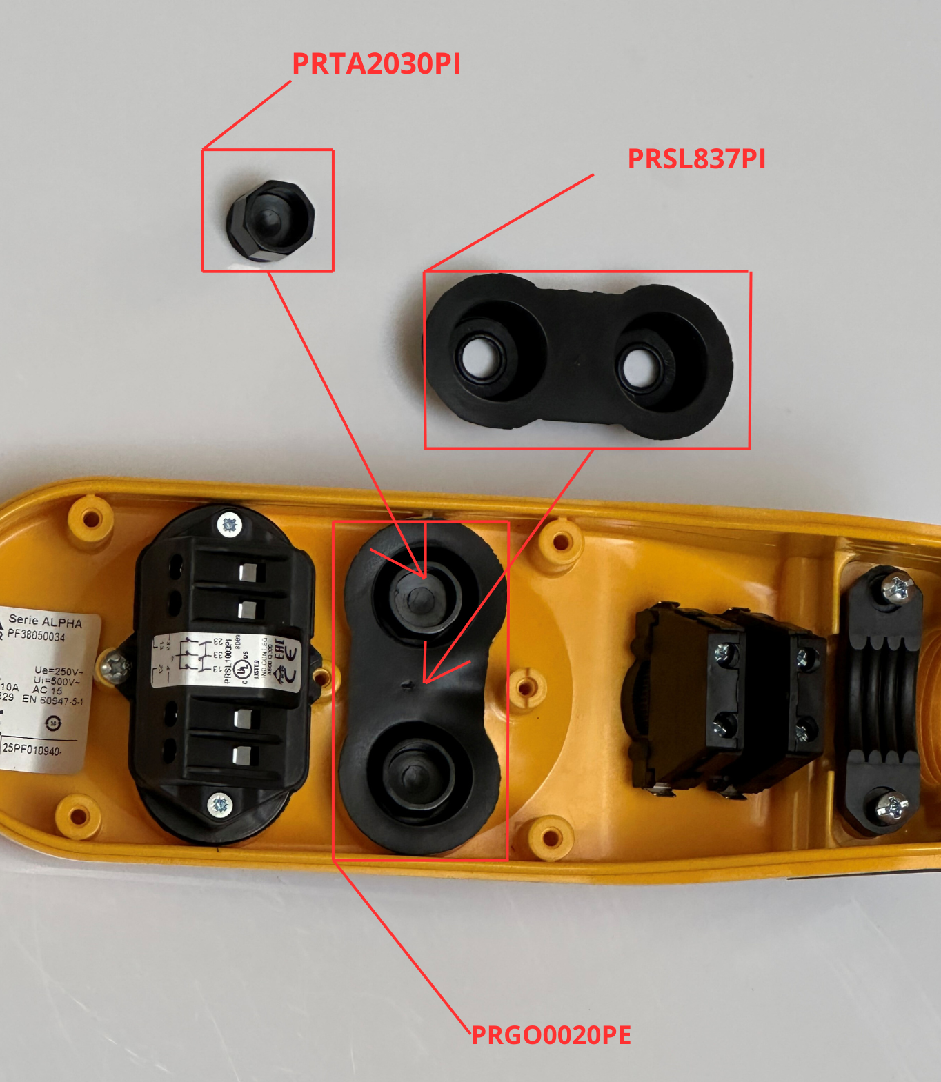 Inne nazwy Uchwyt PRGO0020PE N0001253 TER: 0389, do sterowników wiszących Alpha, Charlie, do pilota, suwnicy, kasety sterującej, kompatybilny z PRTA2030PI PRSL8737PI uchwyt plastikowy kaseta sterownicza pilot podwójny przycisk pokrowiec na podwójny guzik przycisk osłona gumowy czarny